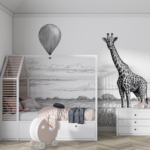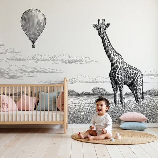 KidsWallVie lapsesi mukaan mielikuvitusmatkalle tämän lastenhuoneen tapetin avulla, jossa majesteettinen kirahvi tarkkailee ilmapalloa avoimella taivaalla....