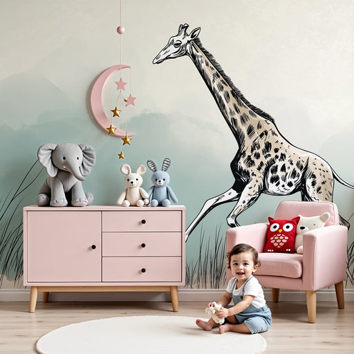 Näytä kaikki tiedotLastenhuoneen tapetti | Juokseva kirahvi savannilla