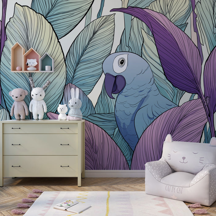 Muuta lapsesi huone todelliseksi kasviparatiisiksi tämän lastenhuoneen tapetin avulla, joka esittää värikkään linnun pesivän upeiden trooppisten lehtien keskellä. Rauhoittavat sinisen ja violetin sävyt tuovat raikkautta ja eleganssia tilaan, luoden pehmeän ja harmonisen tunnelman.