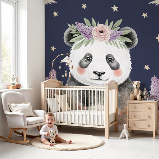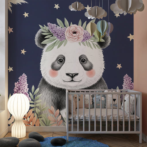 KidsWallMuuta vauvasi huone rauhalliseksi tilaksi tällä vauvan tapetilla, jossa on hurmaava pandakoristus kukkaseppeleellä. Tähtien täyttämällä yönsinisell...