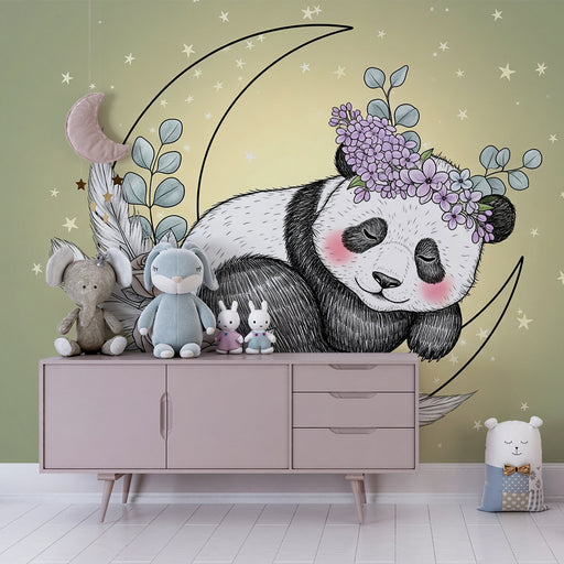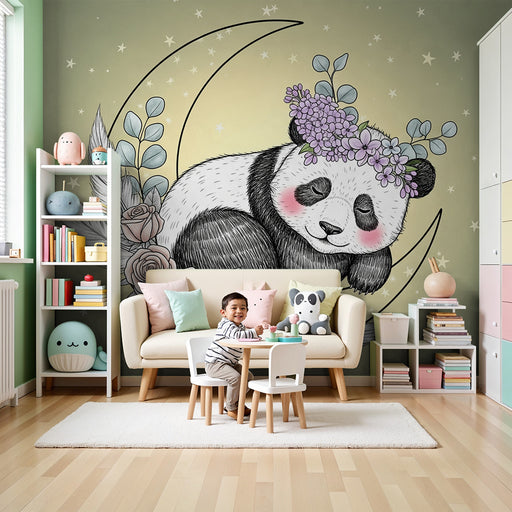 KidsWallMuuta vauvasi huone todelliseksi pehmeäksi pesäksi tällä rauhoittavalla taustakuvalla, joka esittää suloista pandaa rauhallisesti nukkumassa kuunsi...
