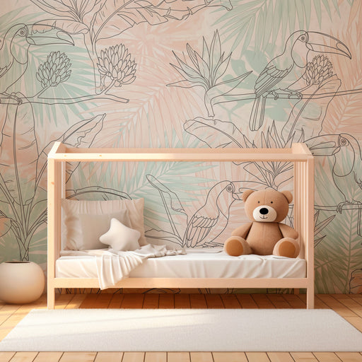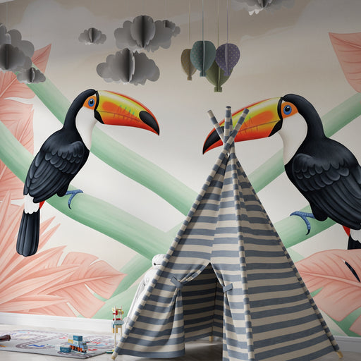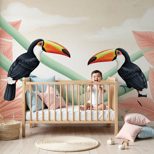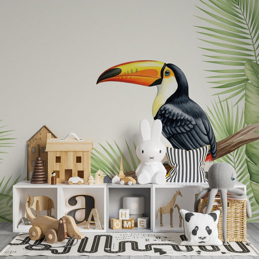 Lastenhuoneen tapetti kuviolla | Värikkäät tukaanit lehtisillä oksilla