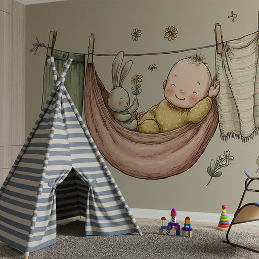 KidsWallCédez à la douceur et à la sérénité avec notre papier peint lapin endormi dans un hamac, parfait pour la chambre de votre bébé. Ce design délicat p...