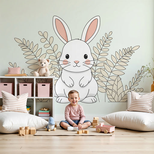 Näytä kaikki tiedotLastenhuoneen tapetti | Söpö pupu ympäröi herkkää lehtikasvillisuutta