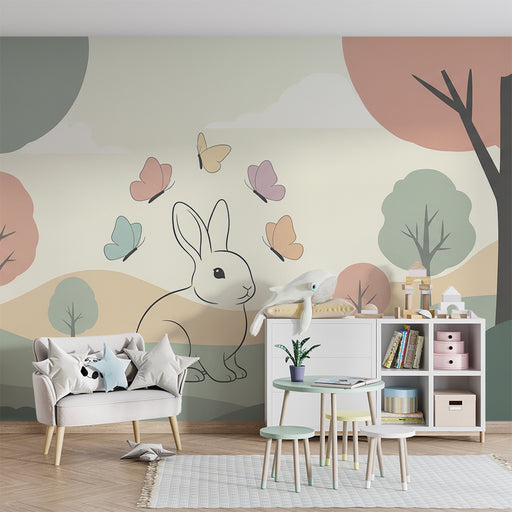 Näytä kaikki tiedotLastenhuoneen tapetti | Söpö pupu ja perhoset lempeässä maisemassa
