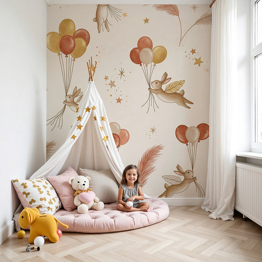 KidsWallMuuta vauvasi huone satumaiseksi maailmaksi tällä lastenhuoneen tapetilla, joka kuvaa ilkikurisia pupuja lentämässä värikkäiden ilmapallojen kanssa...