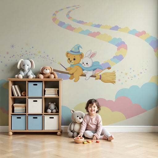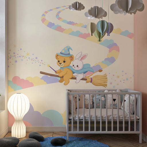 KidsWallLähde satumaiselle matkalle vauvasi huoneeseen tällä lumoavalla vauvan tapetilla. Iloinen karhu, taikurin hattu päässään, ja veikeä pupu lentävät t...