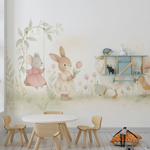 Näytä kaikki tiedotLastenhuoneen tapetti | Hiiri ja pupu keinussa kukkien keskellä
