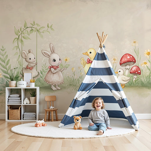 KidsWallTämä suloinen tapetti esittelee viehättävän kohtauksen jänisten ja ankkojen ympäröimänä pehmeillä kukilla ja värikkäillä sienillä. Täydellinen rauh...