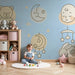Luo lumoava maailma vauvallesi meidän nallejen, kuun ja tähtien kuvioidulla tapetillamme. Täydellinen rauhoittavan tunnelman luomiseen, tämä lastenhuoneen tapetti esittelee lempeitä ja turvallisia hahmoja.