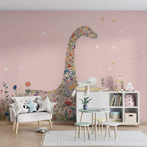 KidsWallMuuta lapsesi huone todelliseksi lumotuksi puutarhaksi valitsemalla dinosaurustapetti kukilla ja vaaleanpunaisilla tähdillä. Tämä taianomainen suun...