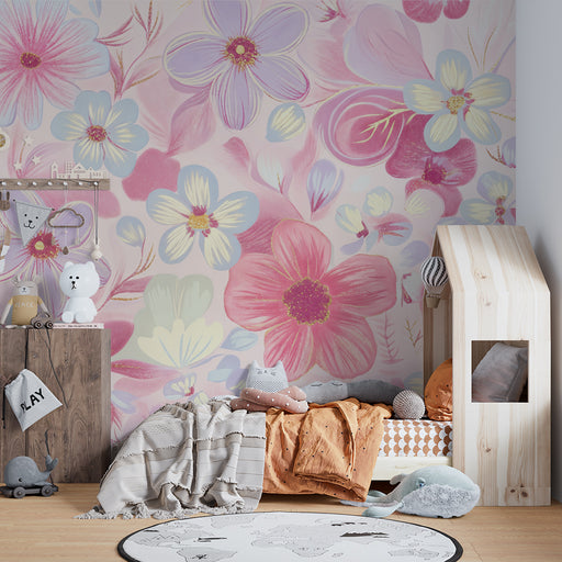 Näytä kaikki tiedotLastenhuoneen tapetti | Vaaleanpastelliset kukat täydessä kukassa