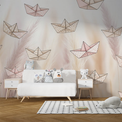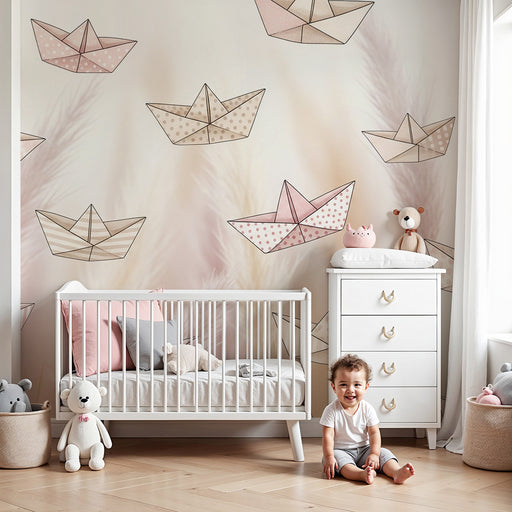 Näytä kaikki tiedotLastenhuoneen tapetti | Origamivenheitä pehmeällä ja luonnollisella taustalla