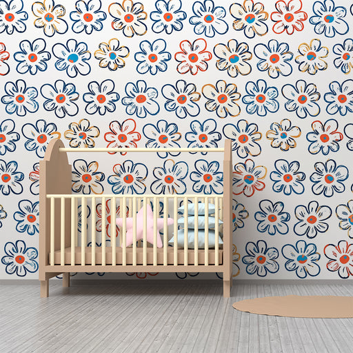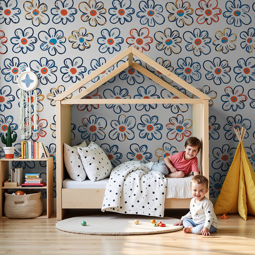 KidsWallTuo iloa lastenhuoneeseen meidän värillisillä ja veikeillä kukkatapeteilla. Tämä lumoava suunnittelu, jossa on kirkkaansinisiä, oransseja ja keltai...