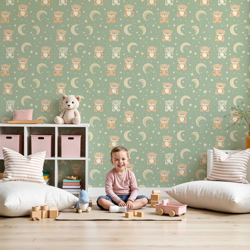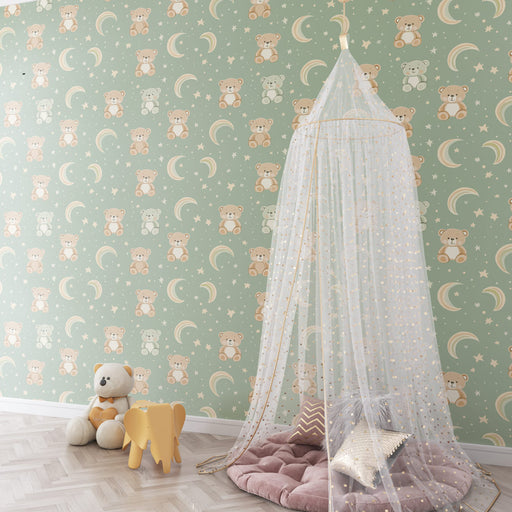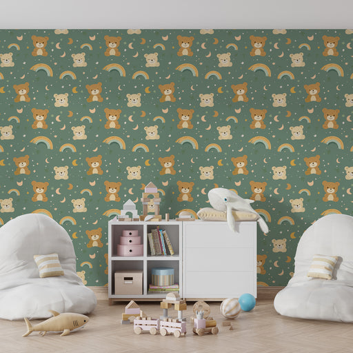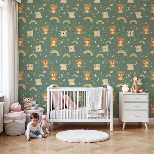 KidsWallMuuta lapsesi huone tällä lastenhuoneen tapetilla, jossa on hurmaavia nalleja ja pehmeitä sateenkaaria. Rauhoittavan vihreän taustansa ansiosta täm...