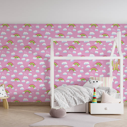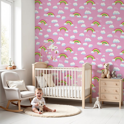 Näytä kaikki tiedotLastenhuoneen tapetti kuvioilla | Sateenkaari vaaleanpunaisella taustalla