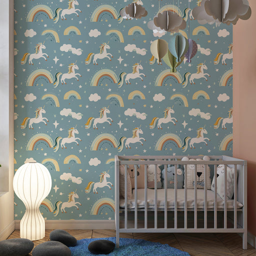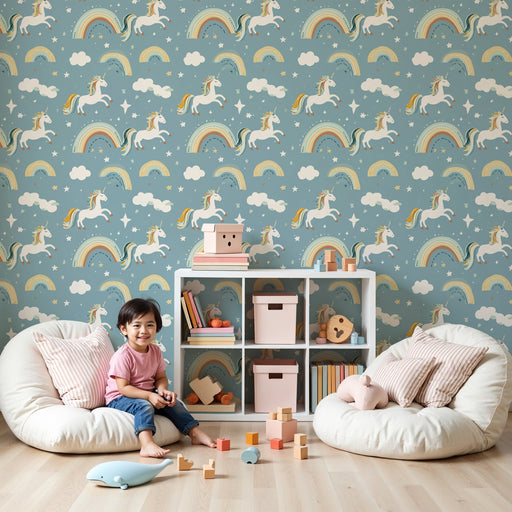 KidsWallMuuta lapsesi huone tällä taianomaisella tapetilla, jossa on herkullisia yksisarvisia ja iloisia sateenkaaria. Tämä leikkisä kuvio luo satumaisen m...