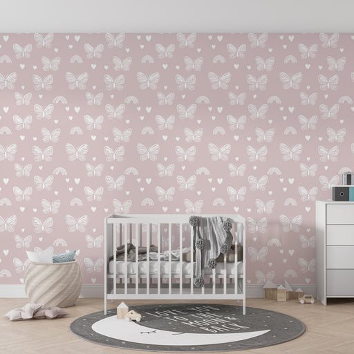 Näytä kaikki tiedotLastenhuoneen tapetti kuvioilla | Herkät perhoset ja sateenkaari vaaleanpunaisella taustalla