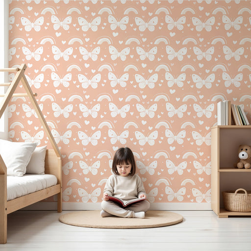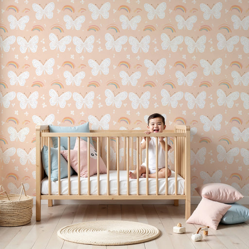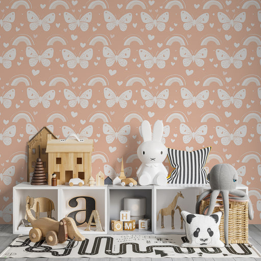 Näytä kaikki tiedotLastenhuoneen tapetti kuvioilla | Perhoset ja sateenkaaret persikkataustalla