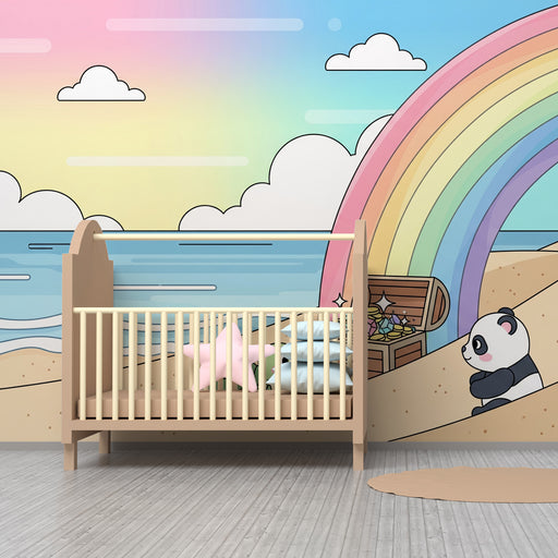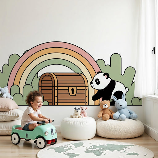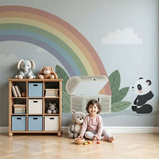 KidsWallLuo pehmeä ja unelias tunnelma vauvanhuoneeseen tällä vauvanhuoneen tapetilla, jossa on suloinen panda edessään salaperäinen arkku kauniin sateenka...