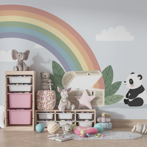 KidsWallMuuta vauvasi huone pehmeäksi maailmaksi tällä vauvan tapetilla, jossa on suloinen panda istumassa kirkkaan sateenkaaren alla. Sateenkaaren pastell...
