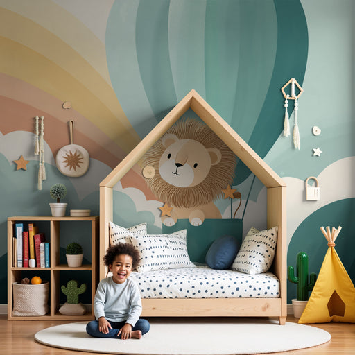 KidsWallLähde taianomaiselle seikkailulle tämän viehättävän lastenhuoneen tapetin kanssa, jossa on suloinen leijona ilmapallolla. Pehmeiden pilvien ja säte...