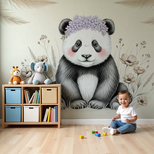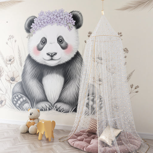 Näytä kaikki tiedotLastenhuoneen tapetti | Söpö pandakarhu kukilla