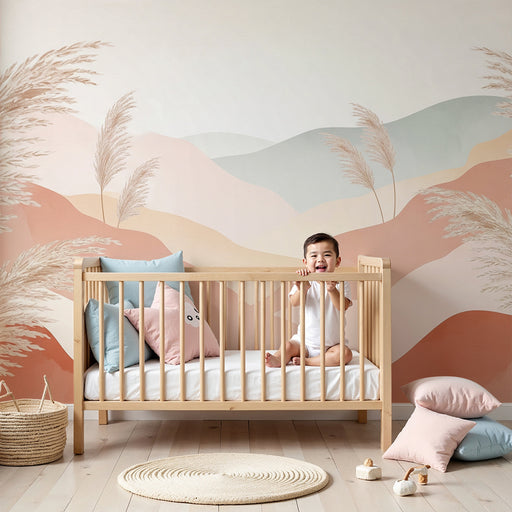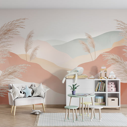 Näytä kaikki tiedotLastenhuoneen tapetti | Lempeät kukkulat ja pampasheinät pastellisävyissä