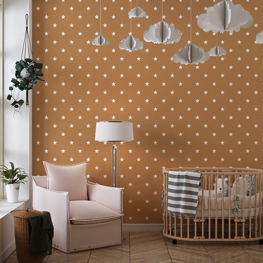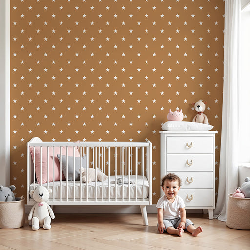 KidsWallTuo taikaa ja pehmeyttä vauvasi huoneeseen tällä vauvan tapetilla, jossa on pieniä valkoisia tähtiä lämpimällä terrakotanvärisellä taustalla. Tämä ...