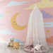 Hellät vaaleanpunaisen, sinisen ja vihreän sävyt tuovat ripauksen taikaa, kun taas iloinen kuun kasvot kutsuvat makeisiin ja lumoaviin uniin. Tämä leikkisä ja viehättävä sisustus stimuloi pienten mielikuvitusta ja seuraa heitä heidän ensimmäisissä yöllisissä löydöissään.