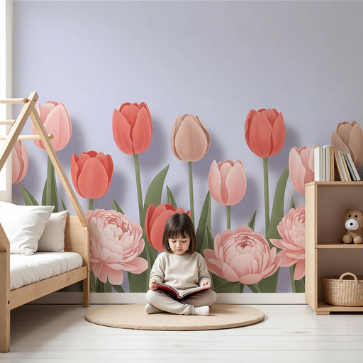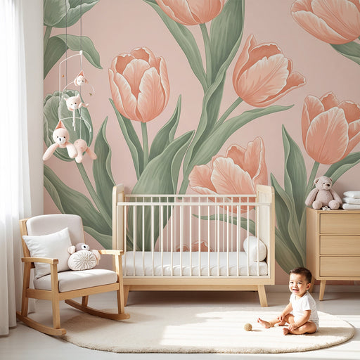 KidsWallKaunista vauvan huonetta tällä pehmeällä ja rauhoittavalla tapetilla, jossa on herkkiä tulppaanikuvioita. Vaaleanpunaisissa ja oransseissa sävyissä...