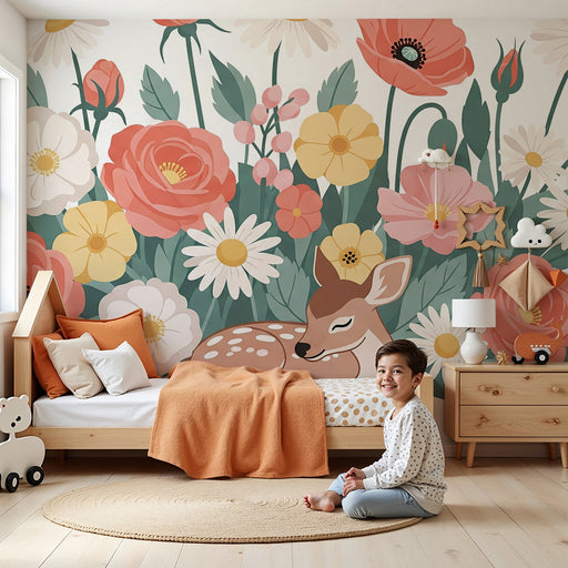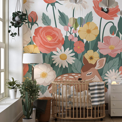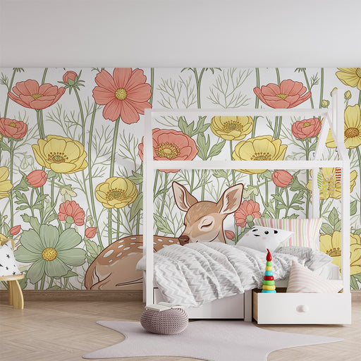 KidsWallLuo herkkä ja lumoava ympäristö vauvasi huoneeseen tällä vauvan tapetilla, jossa on suloisen peuran kuva rauhallisesti lepäämässä värikkäiden kukki...