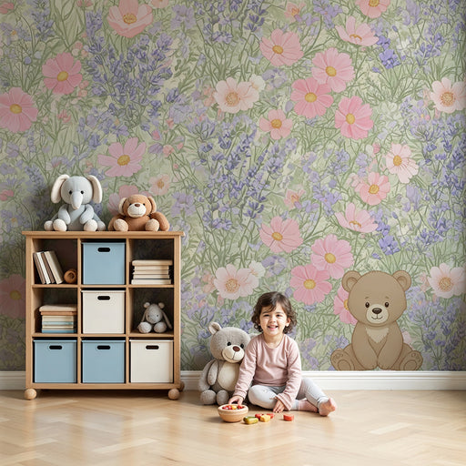Näytä kaikki tiedotLastenhuoneen tapetti | Pieni karhu ja villejä kukkia
