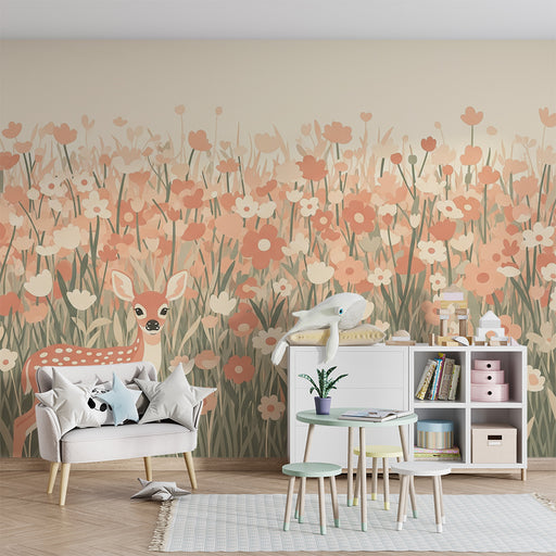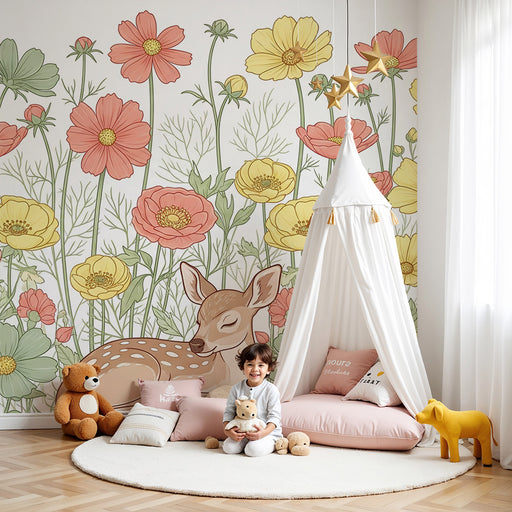Näytä kaikki tiedotLastenhuoneen tapetti | Viehättävä peura kukkien keskellä