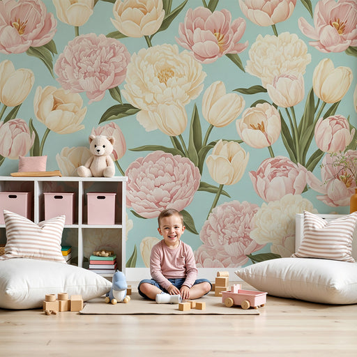 KidsWallMuuta vauvasi tila tällä herkällä kukkakuvioidulla vauvan tapetilla. Vaaleanpunaiset ja kermaiset tulppaanit ja pionit kukoistavat vaaleansinisellä...