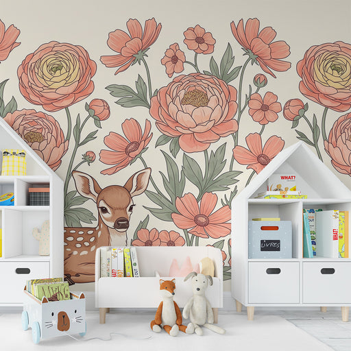 KidsWallLuo rauhan keidas vauvasi huoneeseen tällä vauvan tapetilla, jossa on suloisen peuran lepäämässä kuvankauniiden kukkien keskellä. Vaaleanpunaiset j...