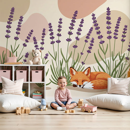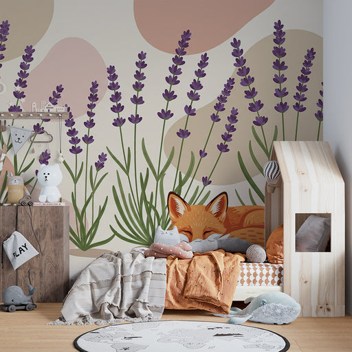 Näytä kaikki tiedotLastenhuoneen tapetti | Nukkuva kettu laventelien keskellä