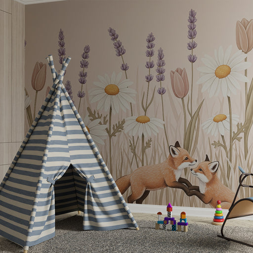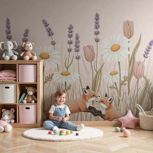 Näytä kaikki tiedotLastenhuoneen tapetti | Utelias kettu kukkien keskellä