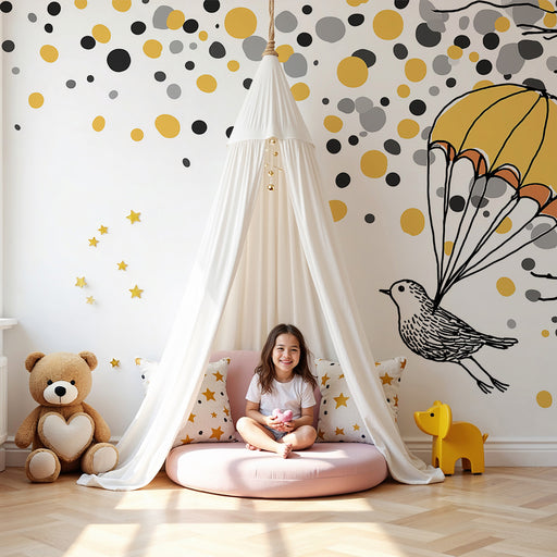 KidsWallAnna vauhtia vauvasi huoneeseen tällä yksilöllisellä tapetilla, jossa on suloinen lintu laskeutumassa varovasti laskuvarjolla. Ympäröity värikkäill...