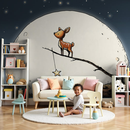 KidsWallLisää vauvan huoneeseen ripaus taikuutta tällä vauvan tapetilla, jossa on suloinen pieni peura oksalla, ihailemassa kirkasta kuuta. Tämä lumoava ku...