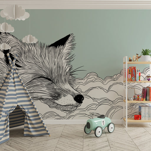 Näytä kaikki tiedotLastenhuoneen tapetti | Nukkuva kettu pilvien keskellä, pehmeä vihreä tausta