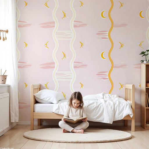 KidsWallTuo pehmeä ja rauhoittava tunnelma lastenhuoneeseen vaaleanpunaisilla raidoilla ja kultaisilla kuun kuvioilla varustetulla tapetilla. Vaaleat raida...