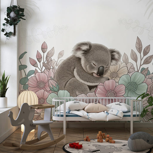 Näytä kaikki tiedotLastenhuoneen tapetti | Nukkuva koala kukkien keskellä