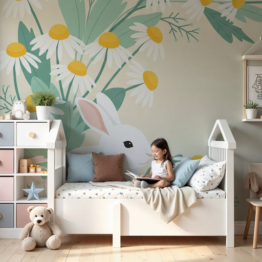 Näytä kaikki tiedotLastenhuoneen tapetti | Jänis ja kukkivat päivänkakkarat