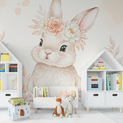 Näytä kaikki tiedotLastenhuoneen tapetti | Lempeä jänis kukkaseppeleellä