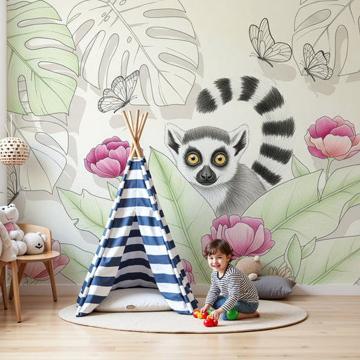 Näytä kaikki tiedotLastenhuoneen tapetti | Utelias maki lemuriaani kukkaisviidakon keskellä