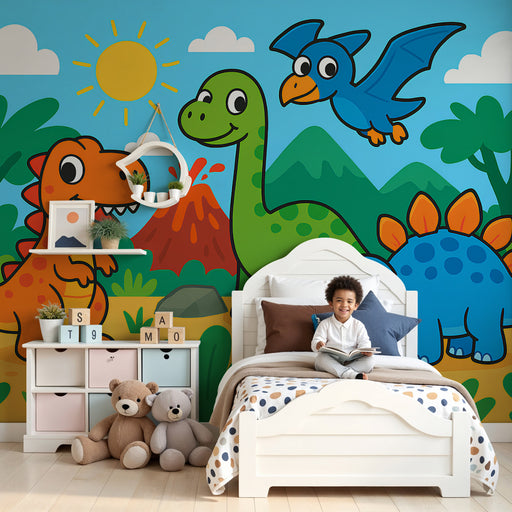 KidsWallMuuta lapsesi huone prähistorialliseksi maailmaksi tämän lasten tapetin avulla, jossa on ystävällinen dinosauruksen ja mahtavan tulivuoren kuvia. T...
