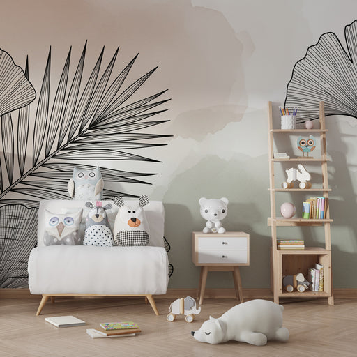 KidsWallMuuta lapsesi huone tällä modernilla taustakuvalla, jossa on stilisoituja lehtikuvioita. Pehmeällä beigellä pohjalla mustat graafiset lehdet piirty...