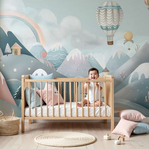 Näytä kaikki tiedotLastenhuoneen tapetti | Unenomaiset vuoret ja taivaalliset kuumailmapallot