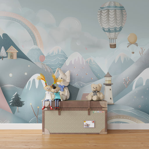 KidsWallTarjoa lapsellesi pakomatka taivaan sydämeen tällä lastenhuoneen tapetilla, joka kutsuu matkustamaan majestettisten vuorten ja kelluvien kuumailmap...